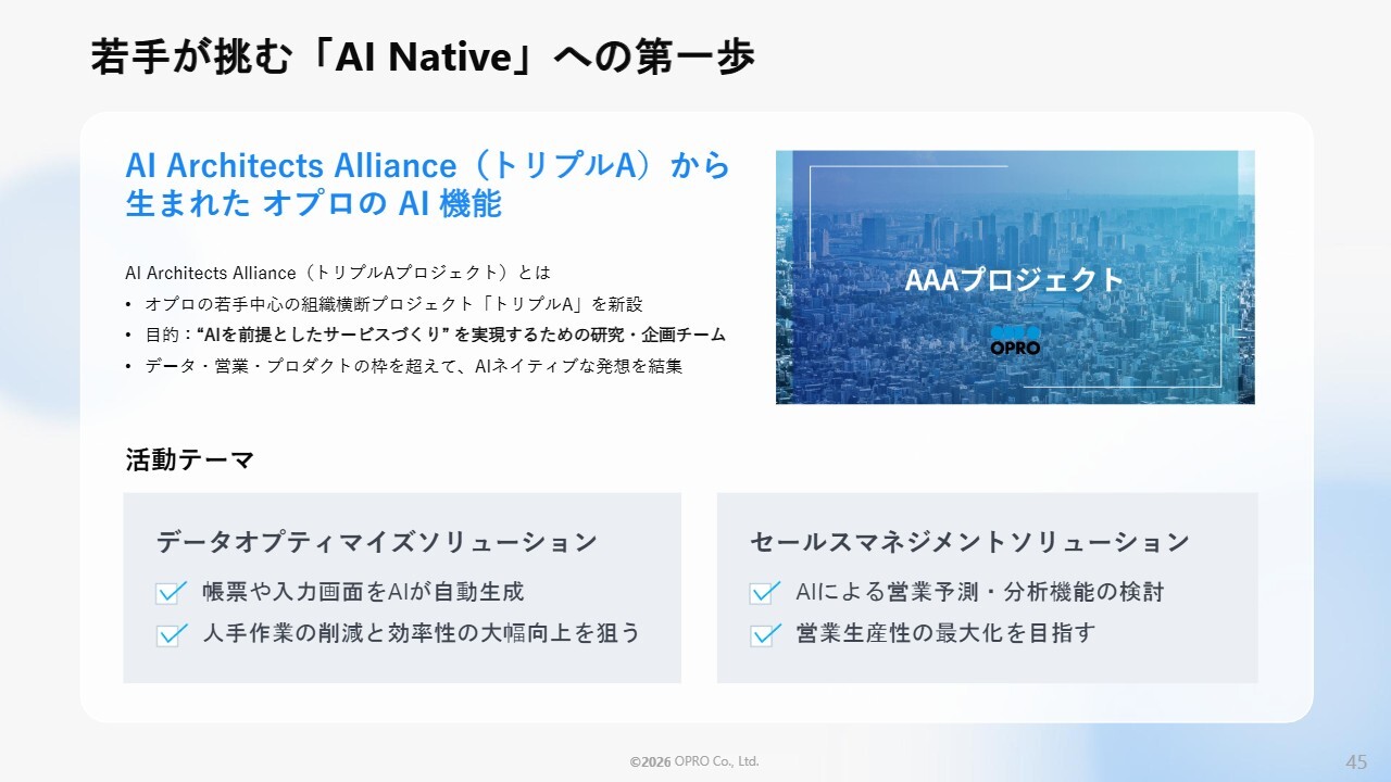 当社では2025年11月期の初めから「AI Architects Alliance(トリプルA)」というプロジェクトを進めてきました。若手を中心に集まり、データオプティマイズソリューションとセールスマネジメントソリューションそれぞれで新しいAI活用プロダクトを検討しました。