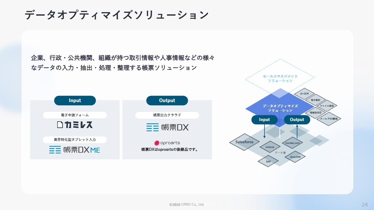 簡単にサービスをご紹介します。まず、データオプティマイズソリューションです。インプットでは「カミレス」と「帳票DXモバイルエントリー」、アウトプットでは「帳票DX」と当社初のクラウドサービスである「oproarts」を提供しています。