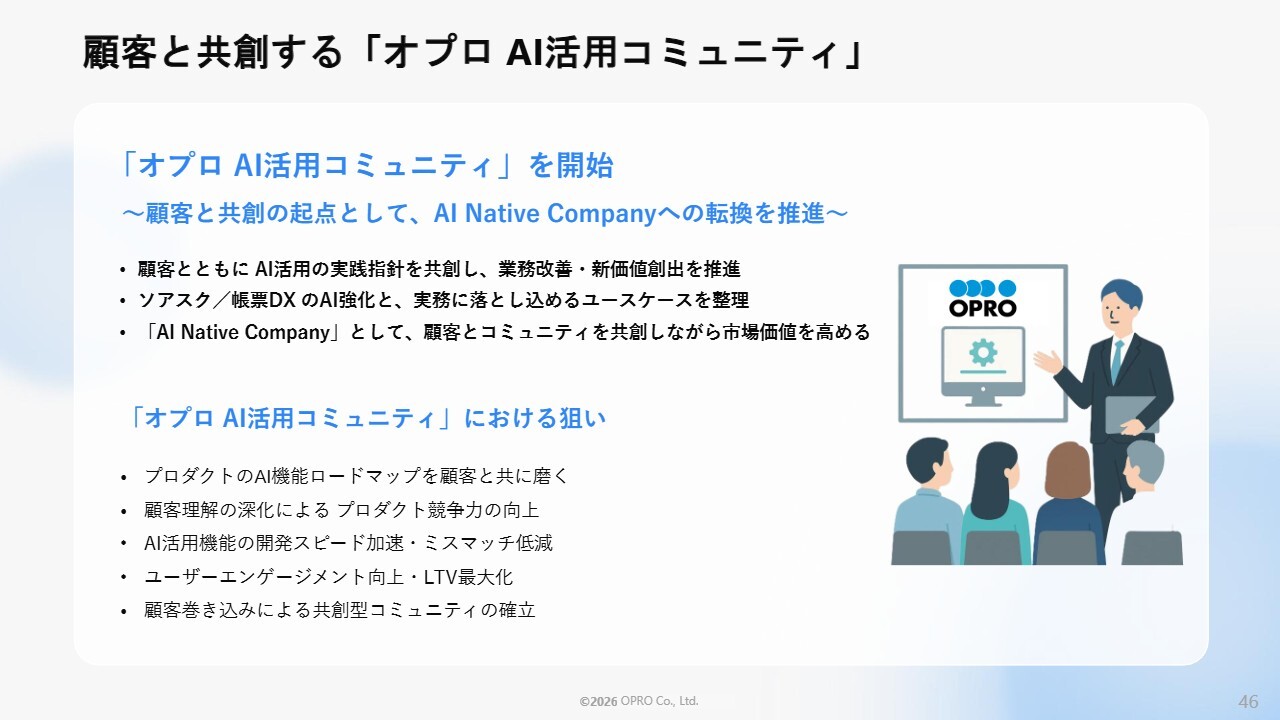 先ほどお話しした「オプロ AI活用コミュニティ」は、今年2月に開始を予定しています。基本的には既存のお客さまと共に進めていく方針です。