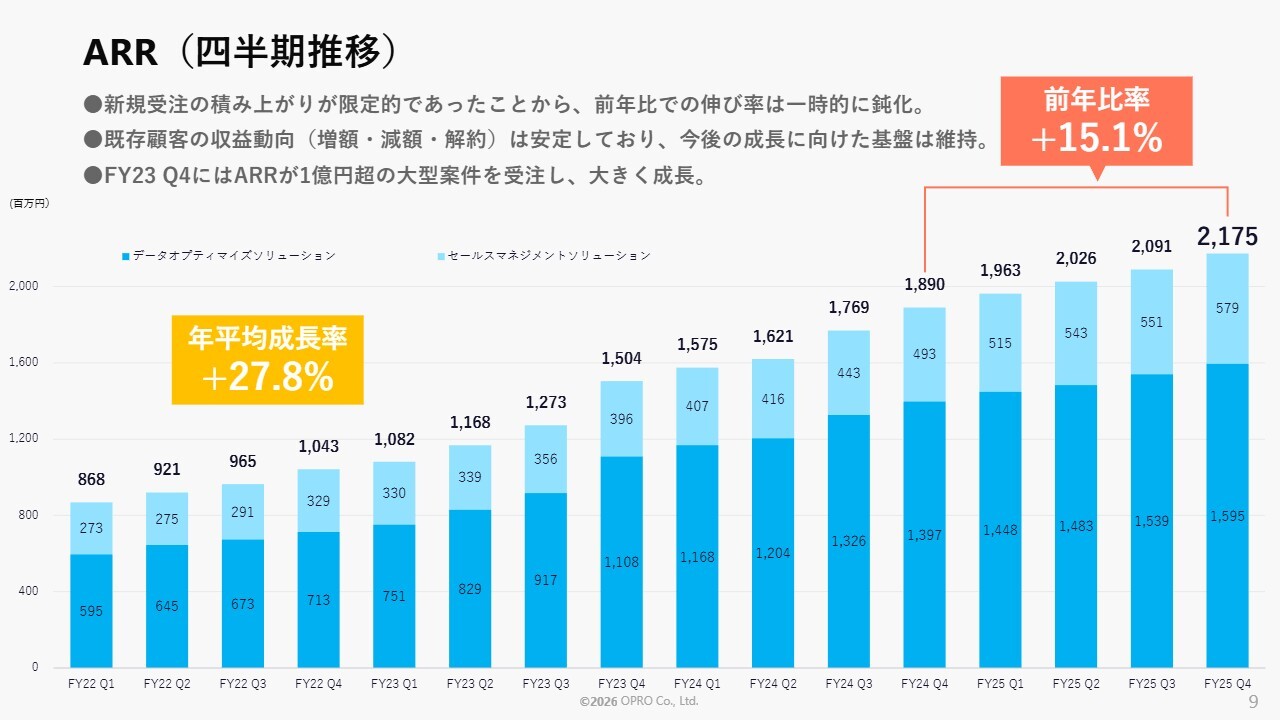 ARRの四半期推移です。前期比プラス15.1パーセントという結果で、当社としては少し残念に感じています。平均で30パーセント近くの成長が必要と考えており、引き続き努力を続けていきたいと思います。