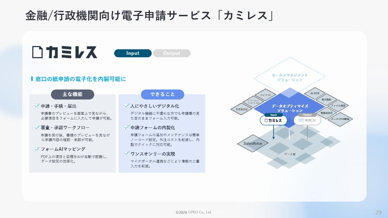 インプットツールである「カミレス」は、紙の申請書を簡単に電子化するソリューションです。紙の申請書をスキャンして画面に取り込み、マウス操作だけで入力フォームを作成できる仕組みになっています。最新ではAI機能を搭載し、PDFを読み込むだけで自動的にフォームを作成することも可能です。