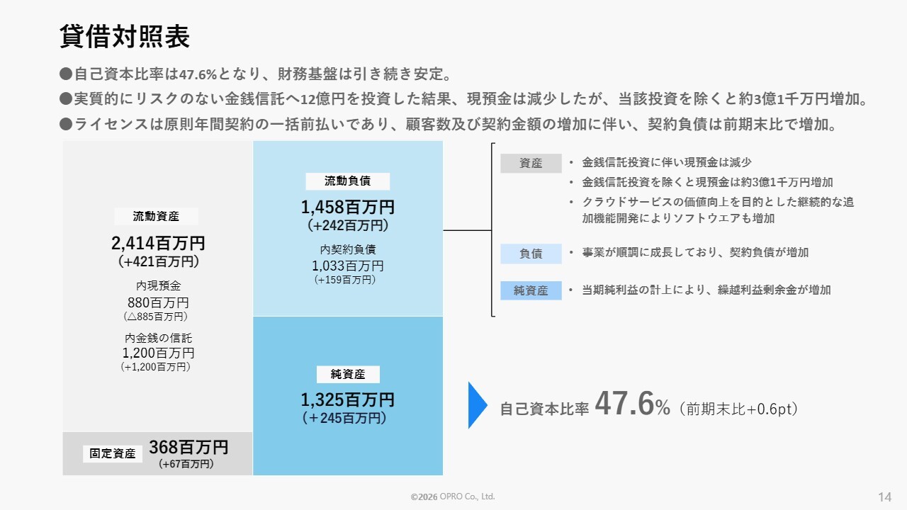 純資産は13億2,500万円となり、前期末比で2億4,500万円増加しました。これは当社が着実に利益を上げられている結果です。その結果、自己資本比率は47.6パーセントとなりました。