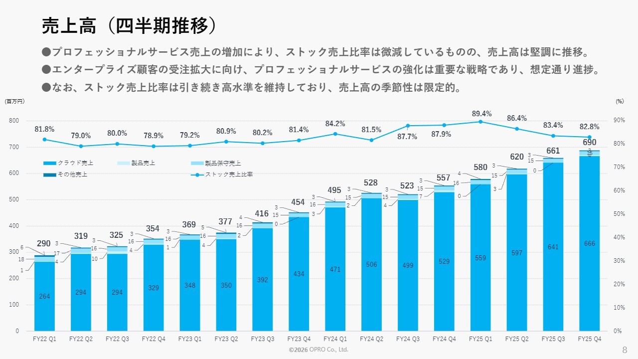 売上高の四半期推移です。順調に推移していますが、ARRの成長がやや低調な結果となりました。そのため、ストック売上比率は微減していますが、引き続き高水準を維持しています。