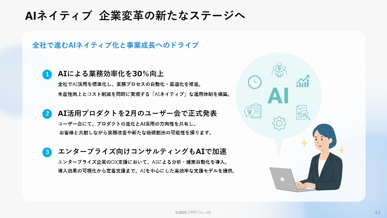 AIネイティブ化を事業成長のドライブ要素として加え、2026年11月期はAI活用により業務効率の30パーセント向上を目指しています。
