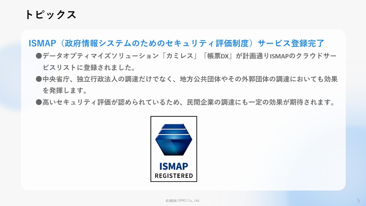 トピックスです。2025年11月期の目標として掲げていた政府情報システムのためのセキュリティ評価制度であるISMAPへの登録は、おかげさまで無事完了しました。