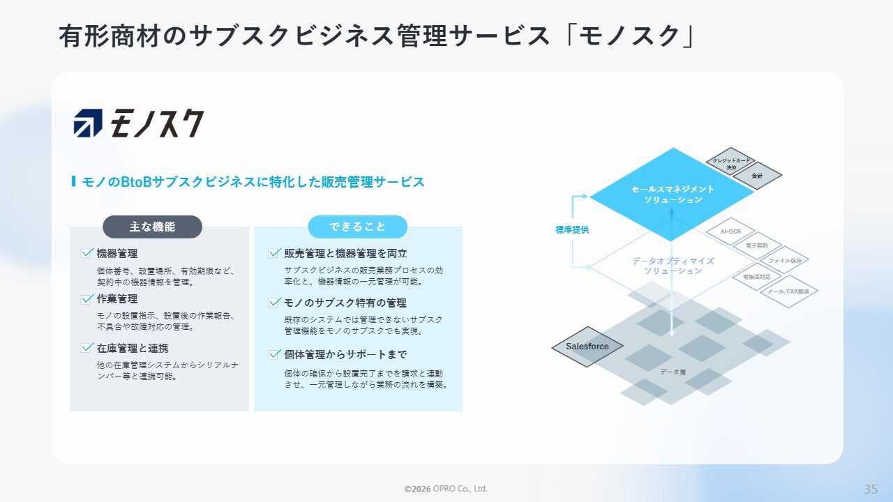 物品が関わる場合には、デリバリーや設置、メンテナンスなどさまざまな要素が絡んできます。それらに対応する追加機能を備えたものが「モノスク」です。