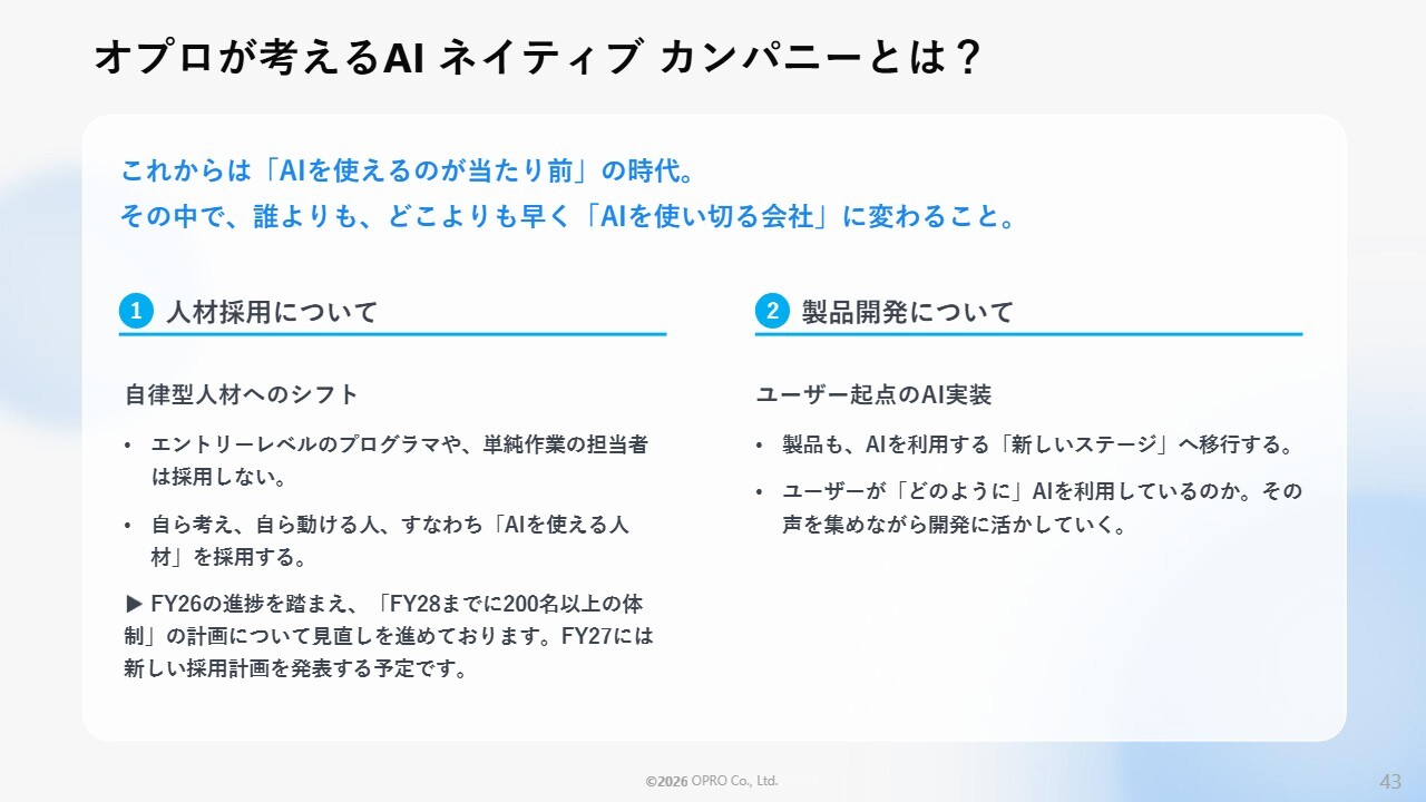 どの程度見直せるかはまだ結論が出ていません。そのため、2026年11月期は引き続きAIへの投資を進めながら、社内へのAIの定着を図り、その結果を踏まえて2027年11月期には新しい採用計画を発表する予定です。