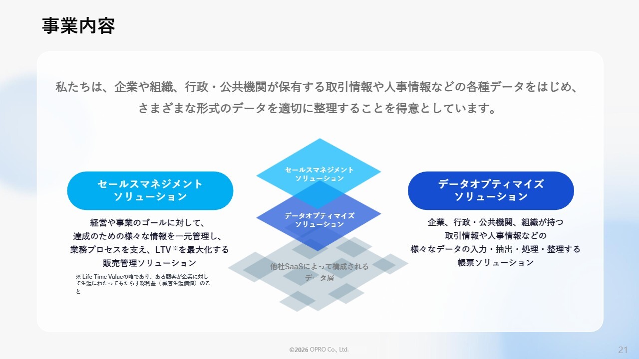 事業内容は大きく2種類あります。1つはデータオプティマイズソリューションです。帳票をベースとしたソリューションで、帳票形式のインプットとアウトプットを提供しています。