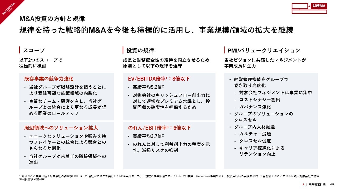 こちらのスライドで投資規律について示しています。具体的には、EV/EBITDA倍率を8倍以下、のれん/EBIT倍率を6倍以下と設定しています。これまでの実績で見ると、EV/EBITDA倍率は5倍強に収まっており、8倍以下の基準を十分に満たしています。そのため、将来的にもいわゆる高値づかみ、高すぎるマルチプルの案件には取り組まない方針です。