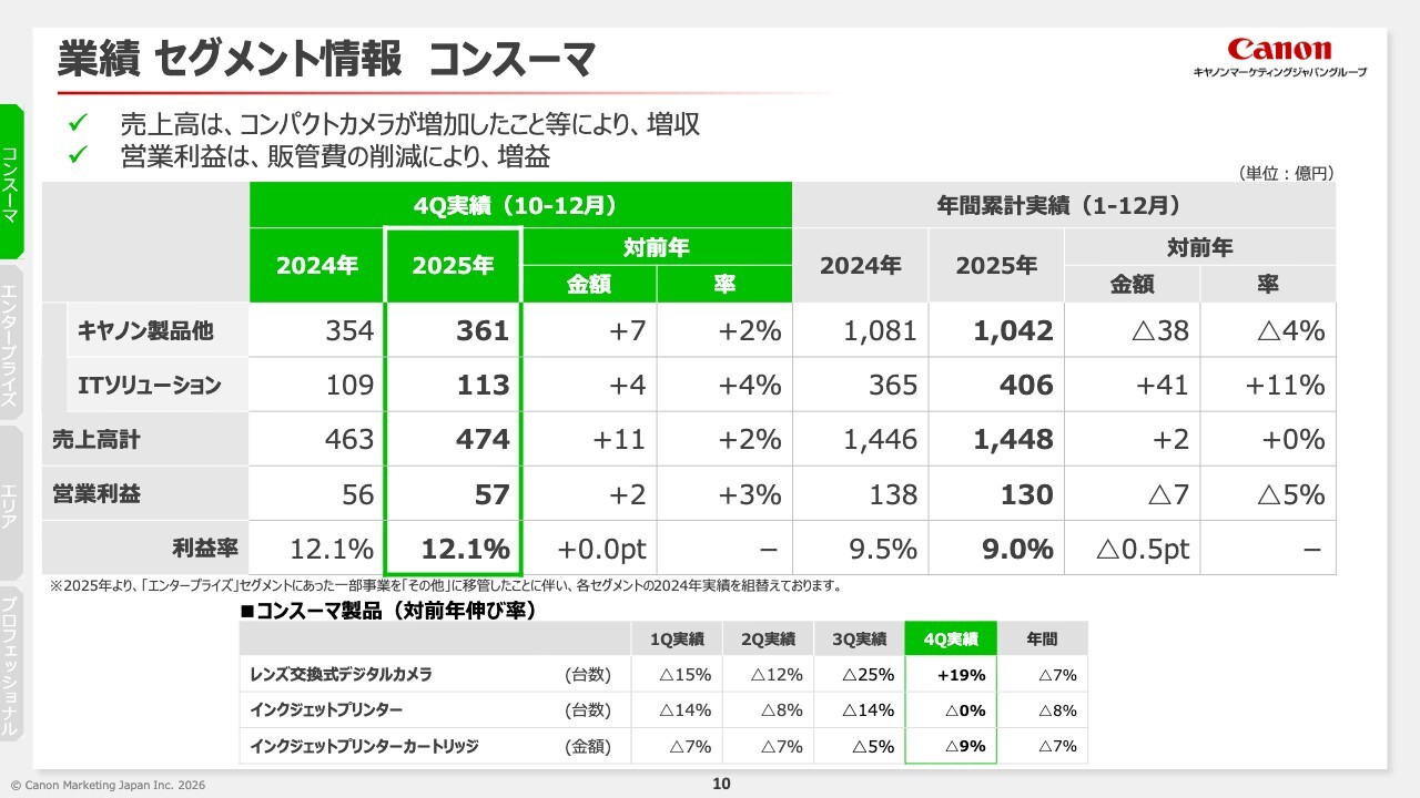 営業利益は、広告宣伝費等の販管費の削減により、対前年2億円増の57億円となりました。レンズ交換式デジタルカメラについては、2025年11月に発売した「EOS R6 Mark III」等が増加したことにより、台数は対前年19パーセント増となりました。