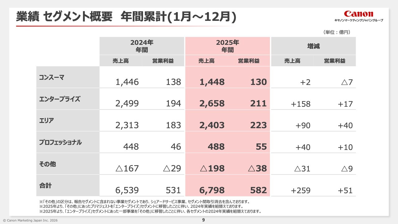2025年12月期累計のセグメント別の実績概要です。売上は、すべてのセグメントで増収となりました。営業利益は、コンスーマセグメントで減益となりましたが、エンタープライズセグメント、エリアセグメント、プロフェッショナルセグメントで増益となりました。