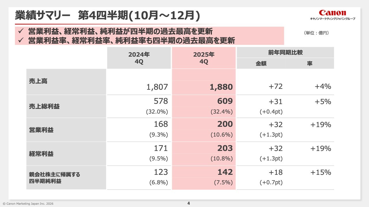 先ほどお伝えしたとおり、第4四半期は、対前年で増収増益となり、営業利益、経常利益、純利益は、四半期の過去最高を更新しました。