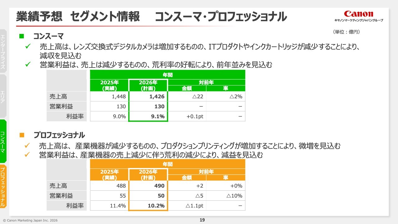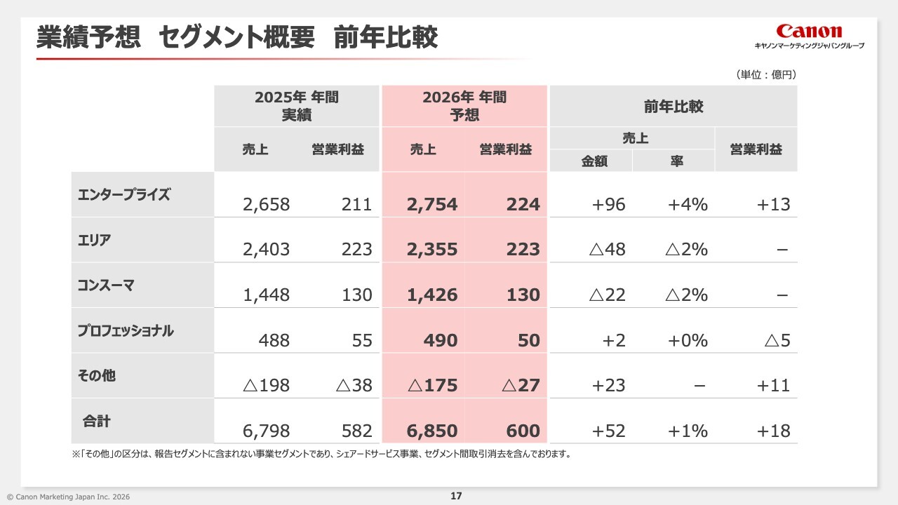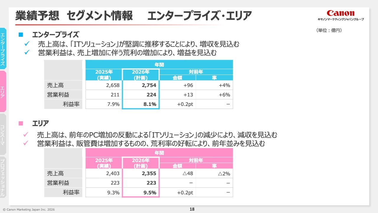 営業利益については、プロフェッショナルセグメントで減益となりますが、エリアセグメント、コンスーマセグメントで前年並み、エンタープライズセグメントで増益となる見込みです。セグメントごとの詳細については、この後ご説明します。