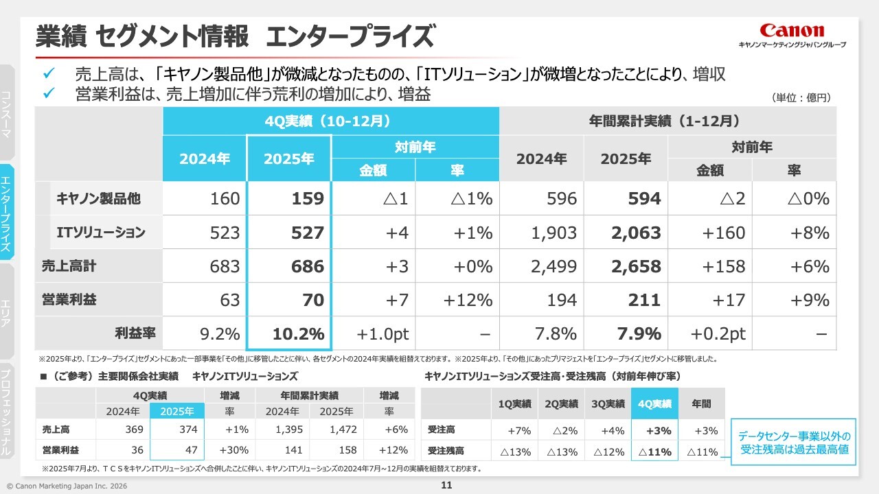第4四半期の売上は、「キヤノン製品他」が微減となったものの、「ITソリューション」が微増となったことにより、対前年0.5パーセント増の686億円となりました。営業利益は、売上増加に伴う荒利の増加に加え、不採算案件の安定化に伴う荒利率の好転により、対前年7億円増の70億円となりました。