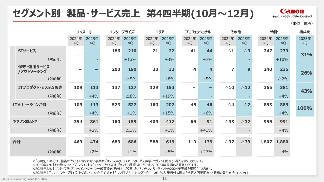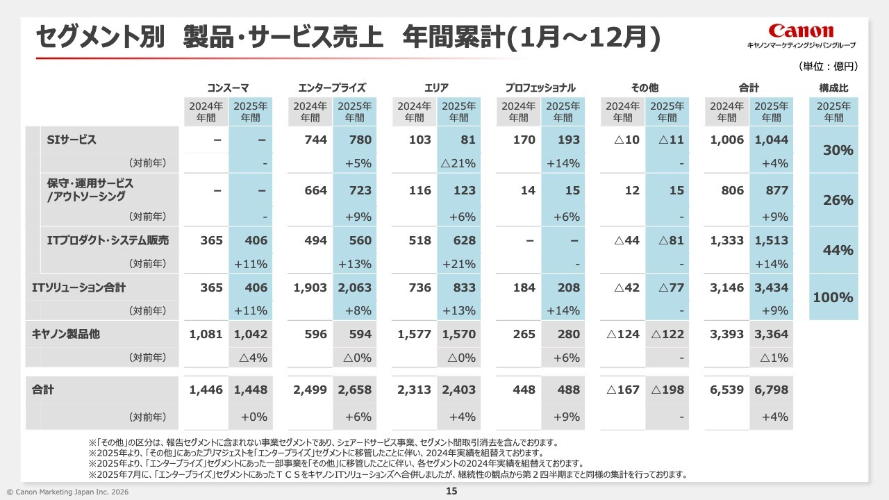7月にTCSをキヤノンITソリューションズへ合併したことに伴い、比較対象となる前年の第3四半期および第4四半期実績を組み替えています。