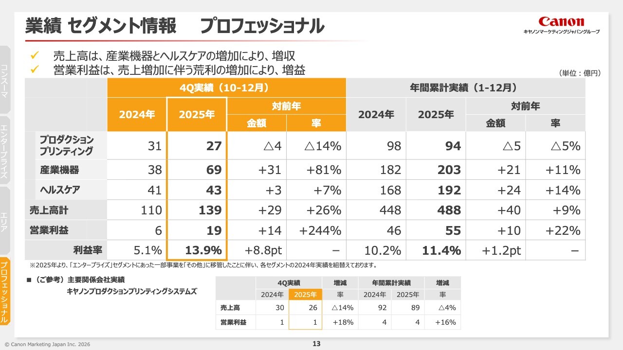 主要関係会社のキヤノンプロダクションプリンティングシステムズの売上は、対前年14パーセント減の26億円となりました。営業利益は、荒利率の好転および販管費の削減により、対前年2,000万円増の1億円となりました。