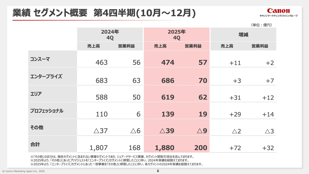 2026年12月期より、セグメントの並び順を変更することとしました。現在のビジネスの状況を踏まえ、エンタープライズ、エリア、コンスーマ、プロフェッショナルの順でご説明します。