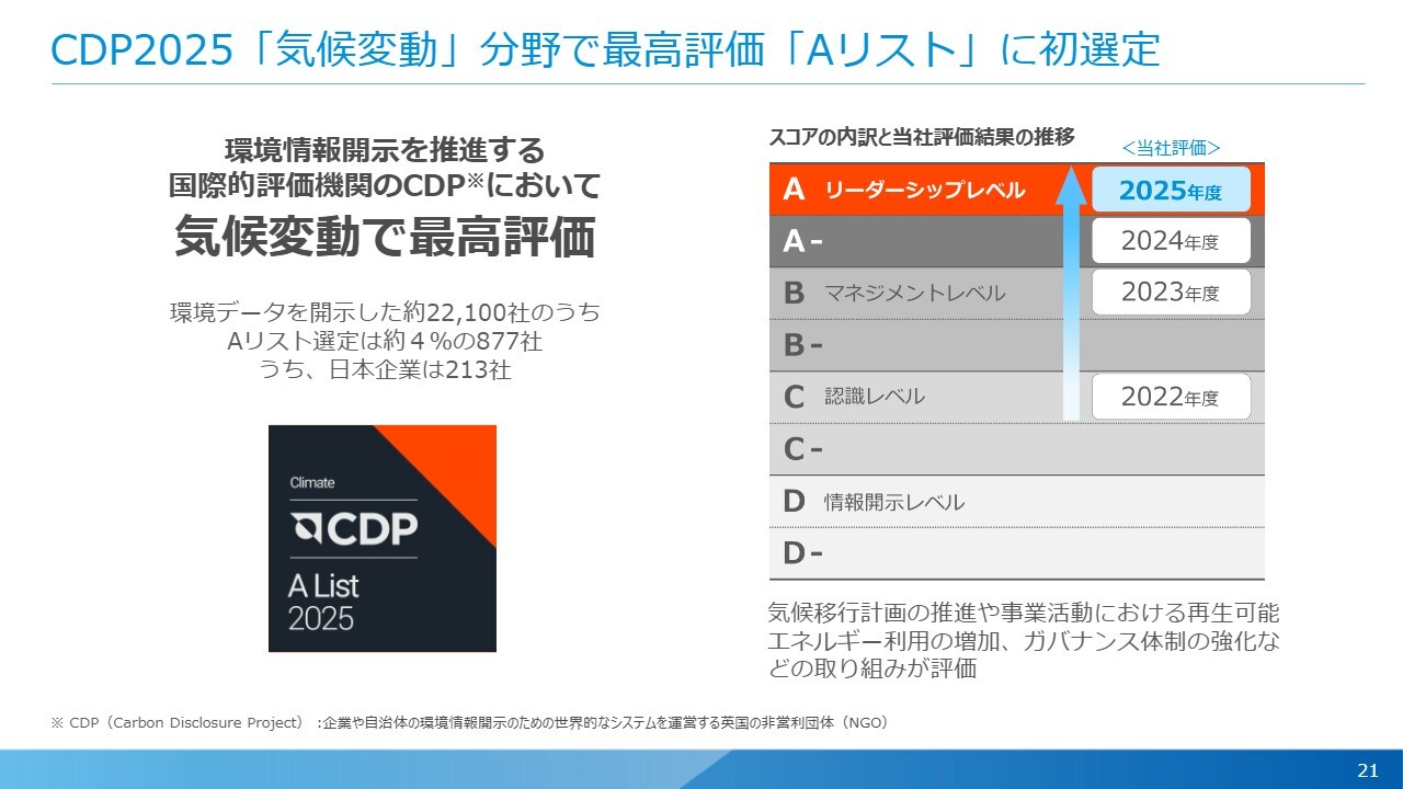 CDP(Carbon Disclosure Project)という国際的な評価機関において、約2万2,100社が環境データを開示している中で、上位4パーセントに入る「Aリスト」に「気候変動」分野で選定されました。