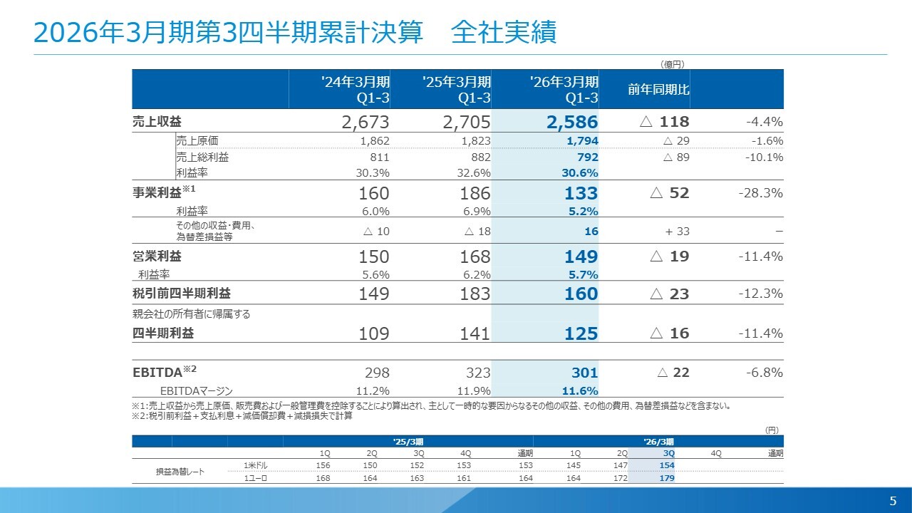 第3四半期の数値面についてご説明します。スライドは第3四半期までの9ヶ月累計の数字です。売上収益は2,586億円で、前年同期比118億円の減収となりました。これに伴い、事業利益は133億円で前年同期比52億円の減益となっています。
