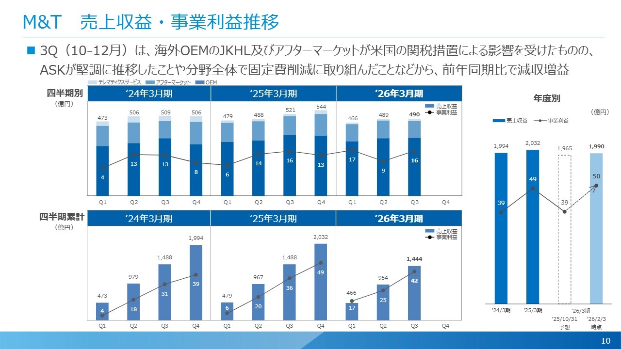 M&T(モビリティ&テレマティクスサービス)分野は、米国の関税措置の影響を受けつつも、海外OEMのASK Industries S.p.A.(以下、「ASK社」)などの売上が堅調に推移しました。その結果、売上は若干減少したものの利益は前年同期比で増益という結果になりました。