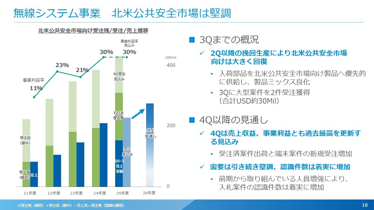 スライド左側のグラフは、北米の公共安全市場における売上と受注の推移を示しています。右から2番目の棒グラフが示すとおり、今期は過去にないレベルの受注を見込んでいます。第3四半期までの売上に受注残からの売上を加えると、通期で約230ミリオンドルを超えるレベルまで成長しています。