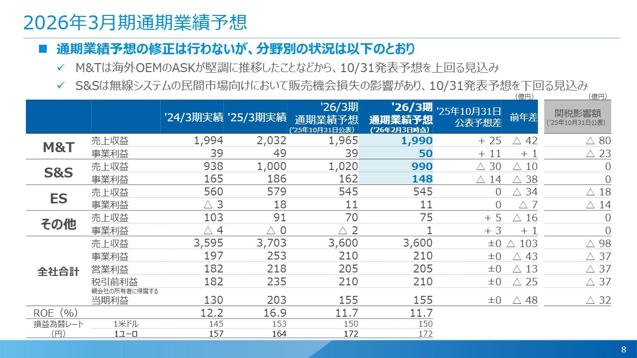 さらにM&T分野が比較的好調な販売の動きが見られることもあり、今回は通期業績予想の修正を行っていません。
