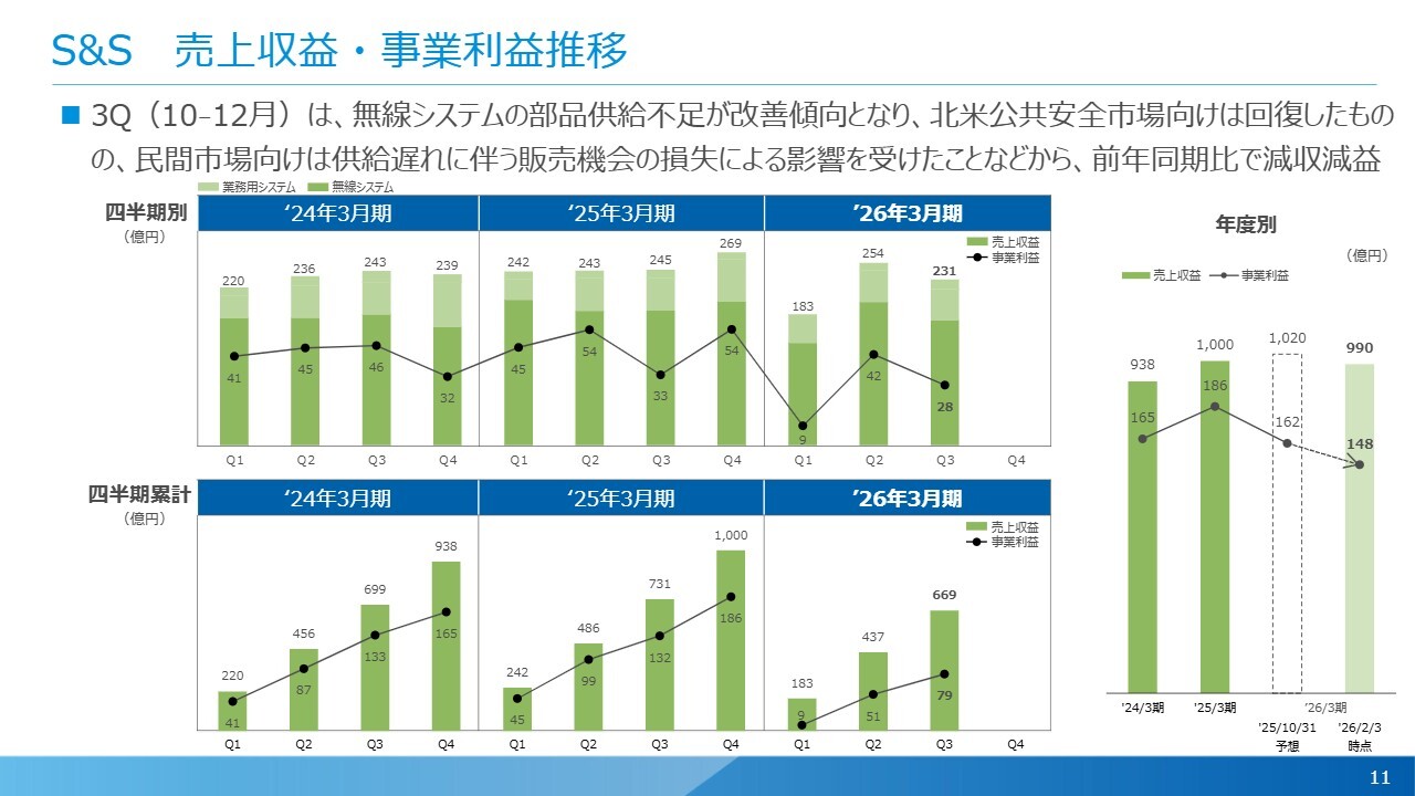 S&S分野の四半期別推移です。第3四半期の実績は売上収益が231億円、事業利益が28億円となりました。無線システム事業の部品供給不足については第2四半期以降改善が進んでおり、第3四半期はほぼ想定どおりの生産を達成しました。