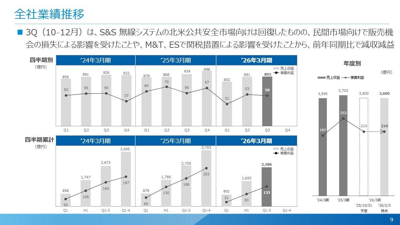 まず第3四半期累計の決算ハイライトです。期初から部品供給不足の影響でS&S(セーフティ&セキュリティ)分野の無線システム事業が非常に苦戦しています。また米国の関税措置の影響を受けて、全社では前年同期比で減収減益となりました。