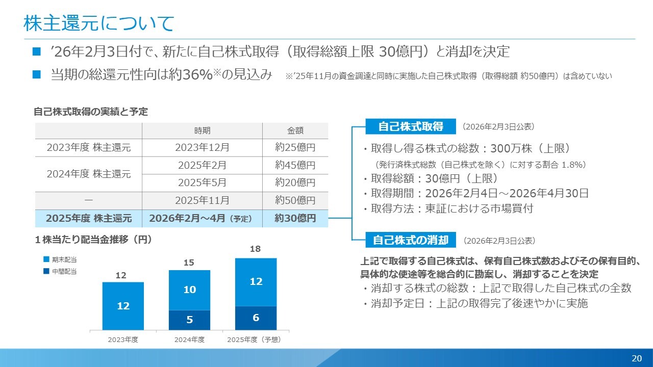 宮本:株主還元についてです。昨日の決算発表と同時に、上限30億円の自己株式の取得とその消却の決定を公表しました。