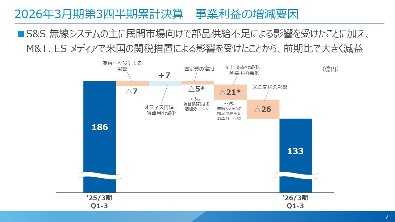 事業利益が減少した大きな要因として、まず売上収益の減少と利益率の悪化により、21億円ほどの影響がありました。このうち35億円ほどは無線システムの部品供給不足による影響と考えています。また米国関税の影響については、26億円と見ています。