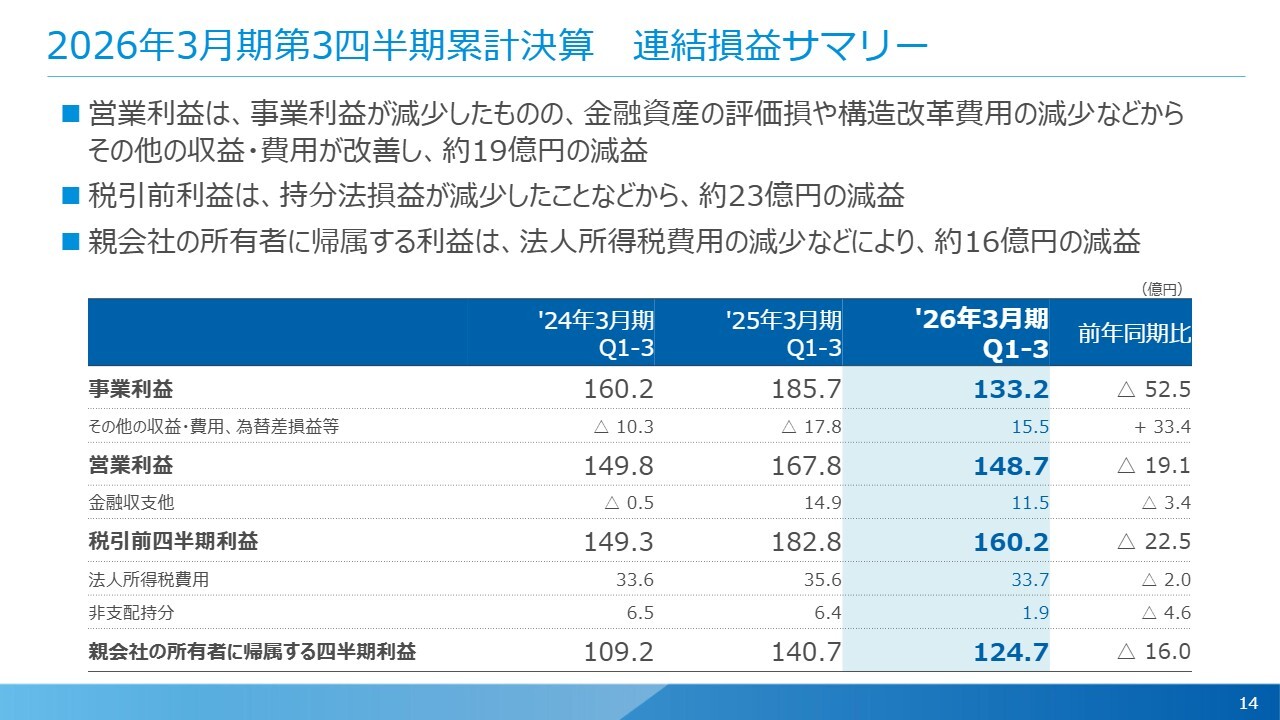 事業利益以下の段階損益のサマリーです。事業利益は第3四半期累計で133億2,000万円という結果となりました。その他の収益・費用、為替差損益等は約16億円のプラスで、前年同期比で約33億円改善しています。これは前期に計上した金融資産の評価損や構造改革費用等が減少したことによるものです。