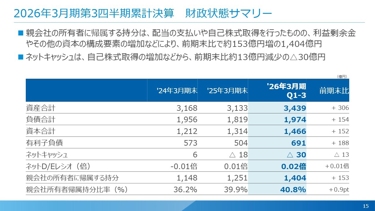 財政状態のサマリーです。親会社の所有者に帰属する持分は1,404億円で、前期末比153億円の増加となりました。こちらは配当の支払いや自己株式の取得などを行ったものの、利益剰余金の増加や円安による為替換算調整のプラスもあり、大きく増加しています。