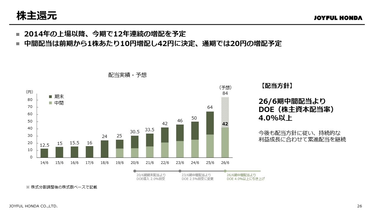 配当についてお伝えします。2026年6月期より、配当方針をDOE4.0パーセント以上に引き上げました。この方針の下、2026年6月期の中間配当については、前期から10円増配となる1株あたり42円としました。また、期末配当を含めた通期配当では、前期比20円の増配を予定しています。