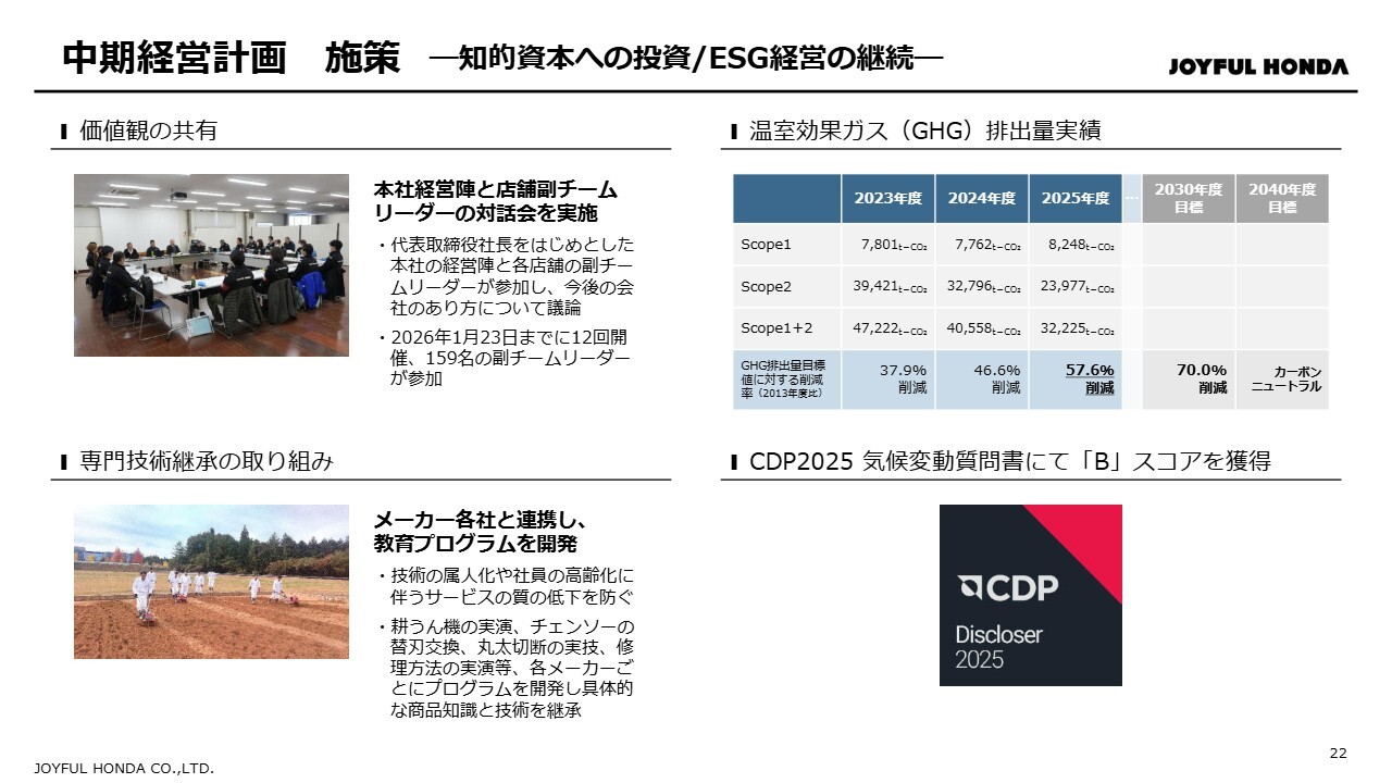 スライド右側に示しているESG経営の継続については、温室効果ガス排出量を前倒しで削減することができており、2040年のカーボンニュートラル実現に向けて取り組みを進めています。さらに、当社は2025年、国際的な環境非営利団体であるCDPが実施する「気候変動質問書」に初めて回答し、その結果として「B」スコアを獲得しました。