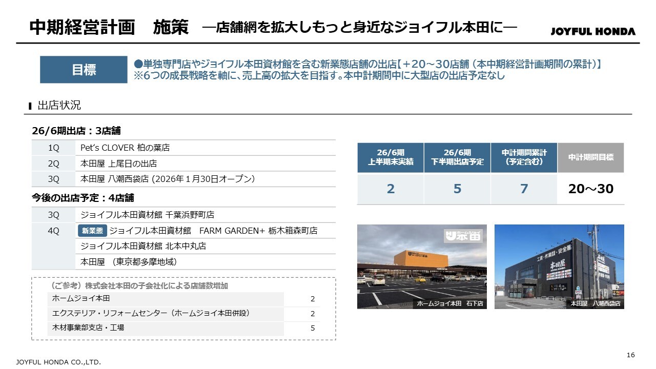 また、株式会社本田の子会社化に伴い、「ホームジョイ本田」2店舗、「エクステリア・リフォームセンター」2店舗、木材事業部の支店および工場5店舗が新たに加わりました。専門店については、足元の業績も好調に推移していることから、来期以降も積極的に出店を進める予定です。