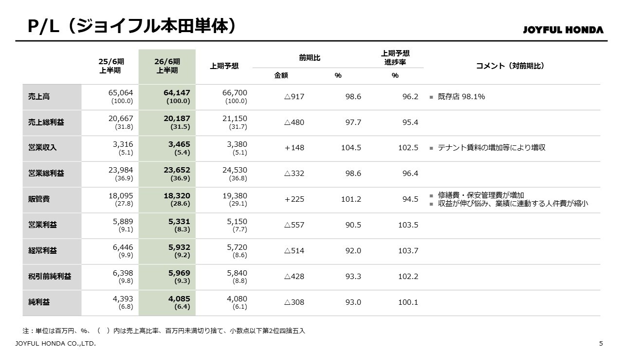 ジョイフル本田単体の損益計算書について、上半期は減収減益となりました。売上高は前期比98.6パーセント、売上総利益は前期比97.7パーセント、営業利益は前期比90.5パーセント、当期純利益は前期比93.0パーセントでした。