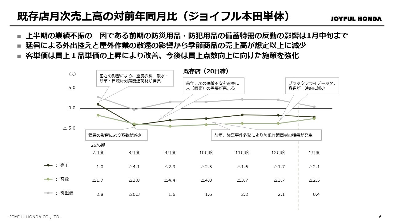 上半期のまとめです。まず、足元の状況を率直にお伝えすると、業績の下振れは全社的な客数減少が主な要因です。さらに、前期に発生した防災用品・防犯用品の特需反動や住宅着工件数の減少に伴う資材需要の弱さが、想定以上に売上に影響を及ぼしています。