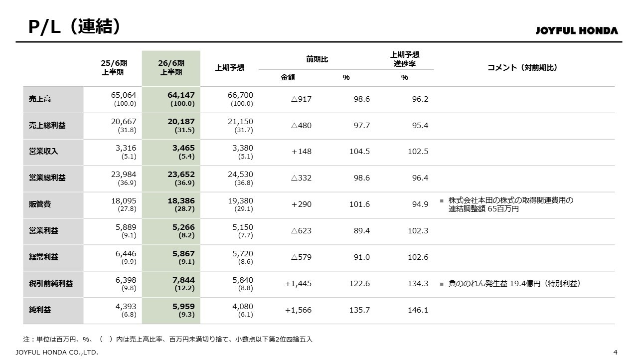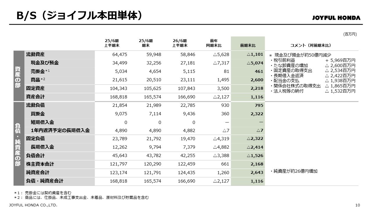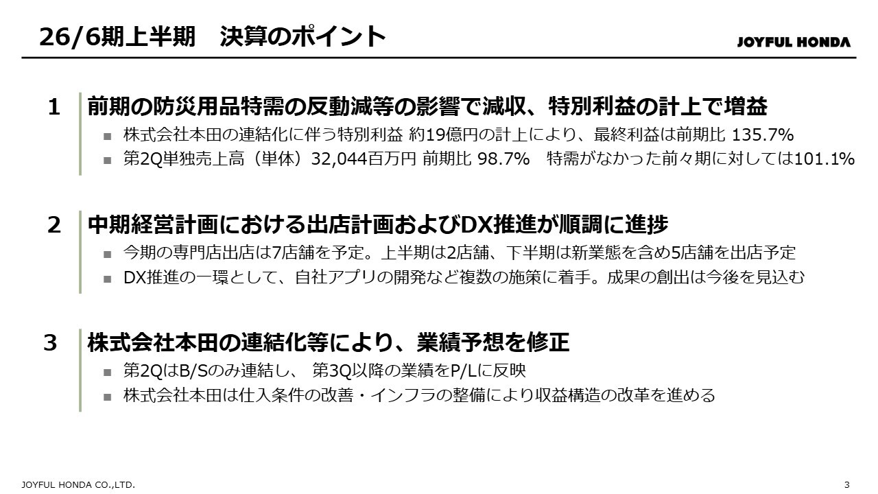 まず、株式会社本田の連結化による影響についてご説明します。当社は2025年9月30日に株式会社本田の全株式を取得し、子会社化しました。これに伴い、2026年6月期より単体決算から連結決算に移行していますので、前期末および前年同期との比較は、2025年6月期の単体決算の数値との比較になります。