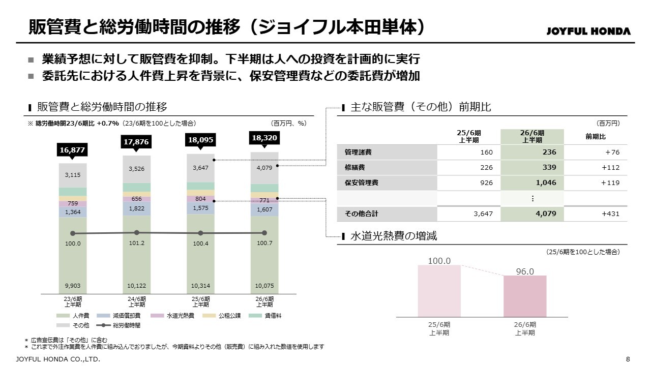 上半期の販管費は、予想比で94.5パーセント、前期比で101.2パーセントでした。販管費が予想を下回った主な要因は、売上総利益の予想未達により人件費が抑制されたことです。一方で、販管費が前期実績を上回った要因は、保安管理費や修繕費の増加です。