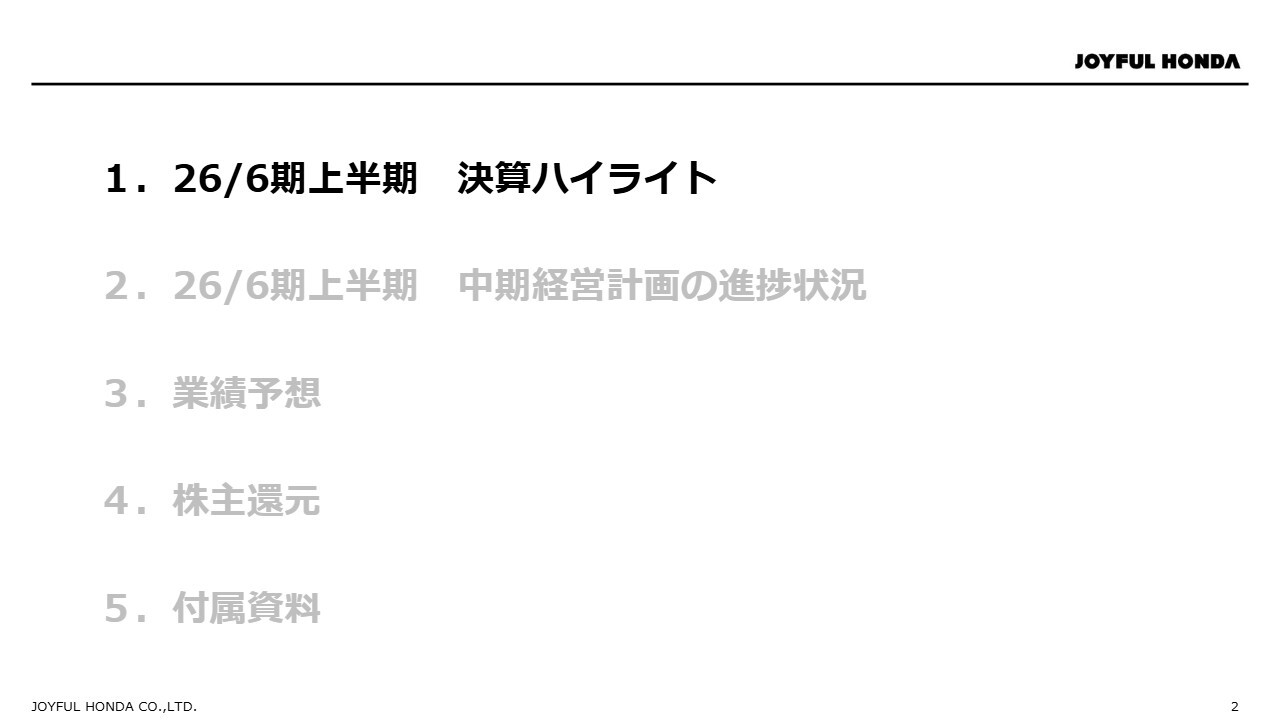 2つ目、中期経営計画における施策は、予定どおり進捗しています。具体的には、2026年6月期の専門店の出店予定数は7店舗です。特に下半期の出店は、新業態の出店を含めて5店舗を予定しています。また、デジタル戦略として、自社アプリの開発をはじめとする複数の施策に着手し、顧客接点の拡大および利便性向上に向けた取り組みを進めています。