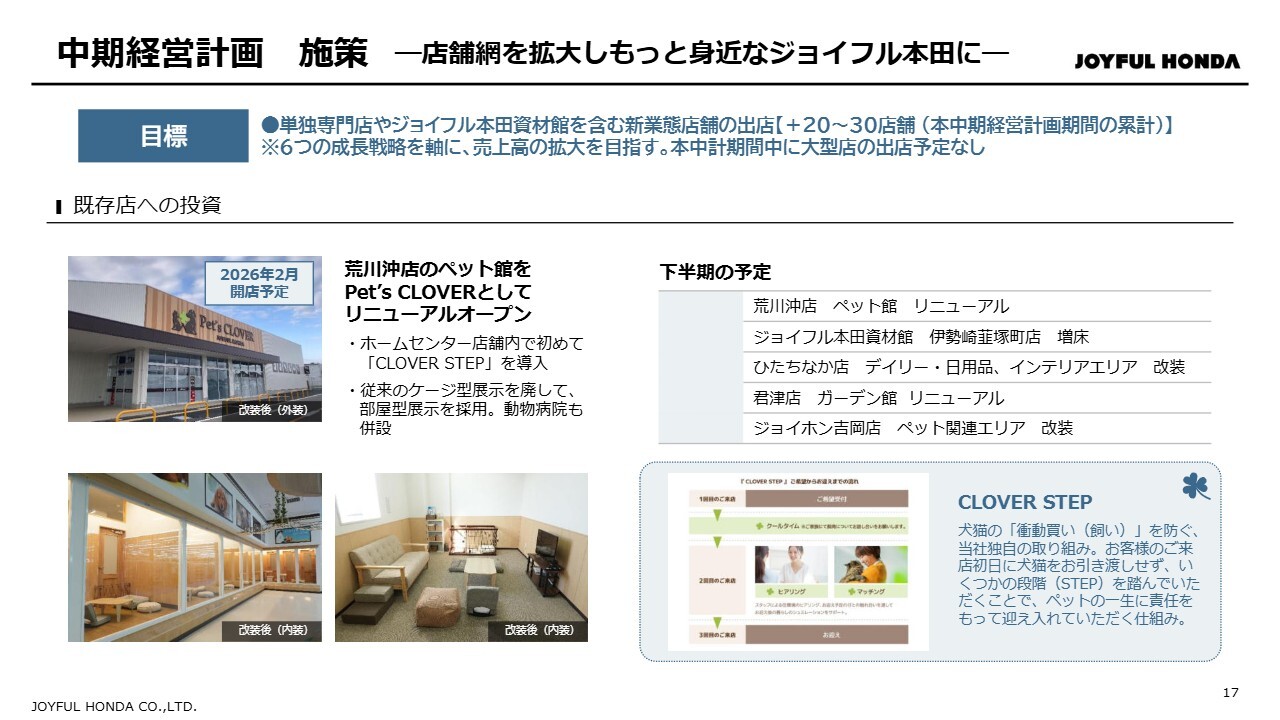 当社の1号店である「ジョイフル本田 荒川沖店」のペット専門館は建物の建て替えを行い、「Pet’s CLOVER」としてリニューアルオープンする予定です。また、既存の「Pet’s CLOVER」にて導入している衝動買い(飼い)を防ぐ取り組み「CLOVER STEP」を、既存店舗で初めて導入します。