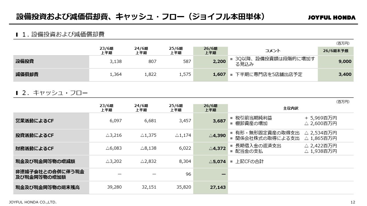 設備投資および減価償却費、キャッシュ・フロー(ジョイフル本田単体)