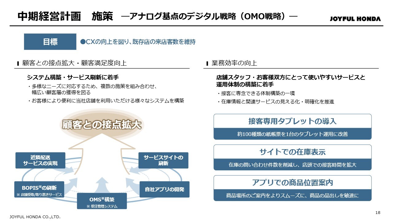 デジタル戦略では、システム構築やサービスの刷新に着手しました。複数の施策を組み合わせることで、今後は幅広い顧客層の獲得を図ります。また、業務効率を向上させる運用体制の構築にも着手しました。具体的には、接客専用タブレットの導入をはじめ、紙帳票の電子化、サイトでの在庫表示、アプリでの商品位置案内などの実装を進めています。