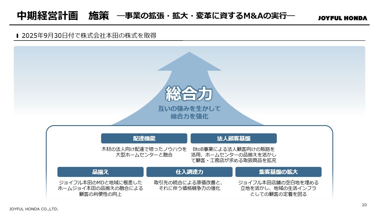 M&Aについては、株式会社本田の株式を取得し、今期から連結化しました。売上高や商圏の拡大に加えて、両社の強みを相互に活かすことで、収益力と集客力のさらなる強化を図っていきます。