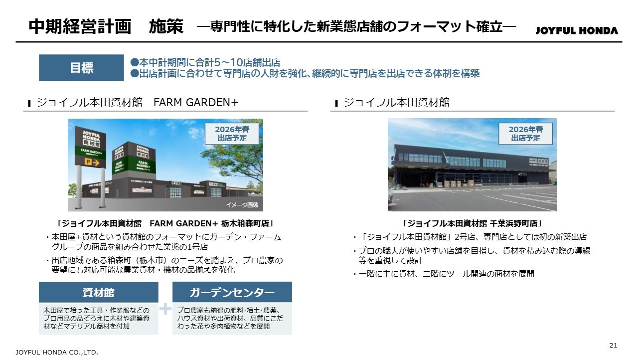 新業態店舗についてご説明します。下半期には、「ジョイフル本田資材館」2店舗と、「ジョイフル本田資材館」をベースにした新業態店舗を出店する予定です。