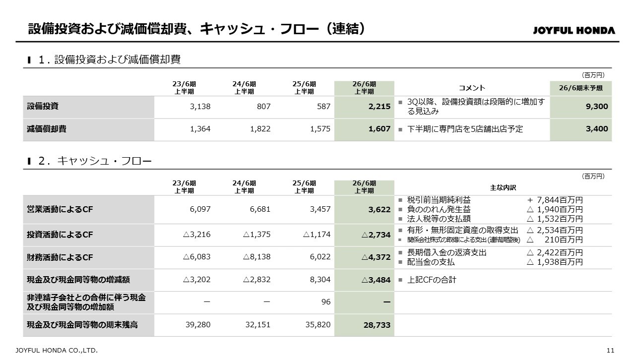 連結の設備投資および減価償却費とキャッシュ・フローについてです。設備投資額は第3四半期以降、段階的に増加する見込みです。また、子会社化した株式会社本田に対するインフラ整備も実施していきます。