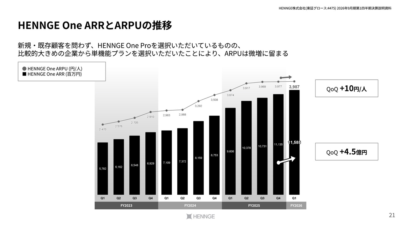 ARRとARPUの四半期ごとの推移は、スライドのとおりです。当四半期は、引き続き新規・既存顧客を問わず、最上位プランであるHENNGE One Proが選択されたものの、比較的大きめの企業から単機能プランが選択されたことが影響し、ARPUは微増にとどまりました。