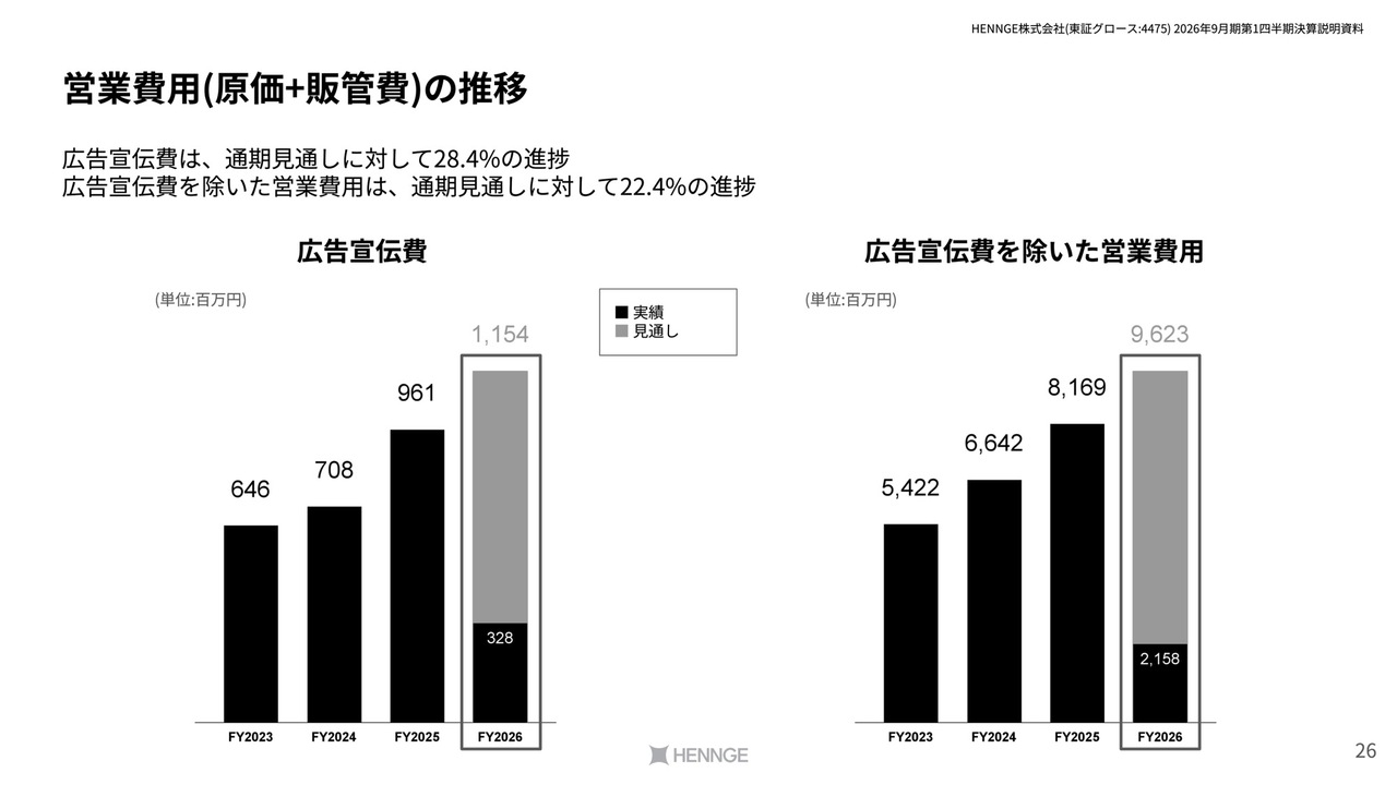 第1四半期の広告宣伝費実績は4億円弱であるため、概ね通期業績予想に沿って進んでいるとご理解いただけるかと思います。