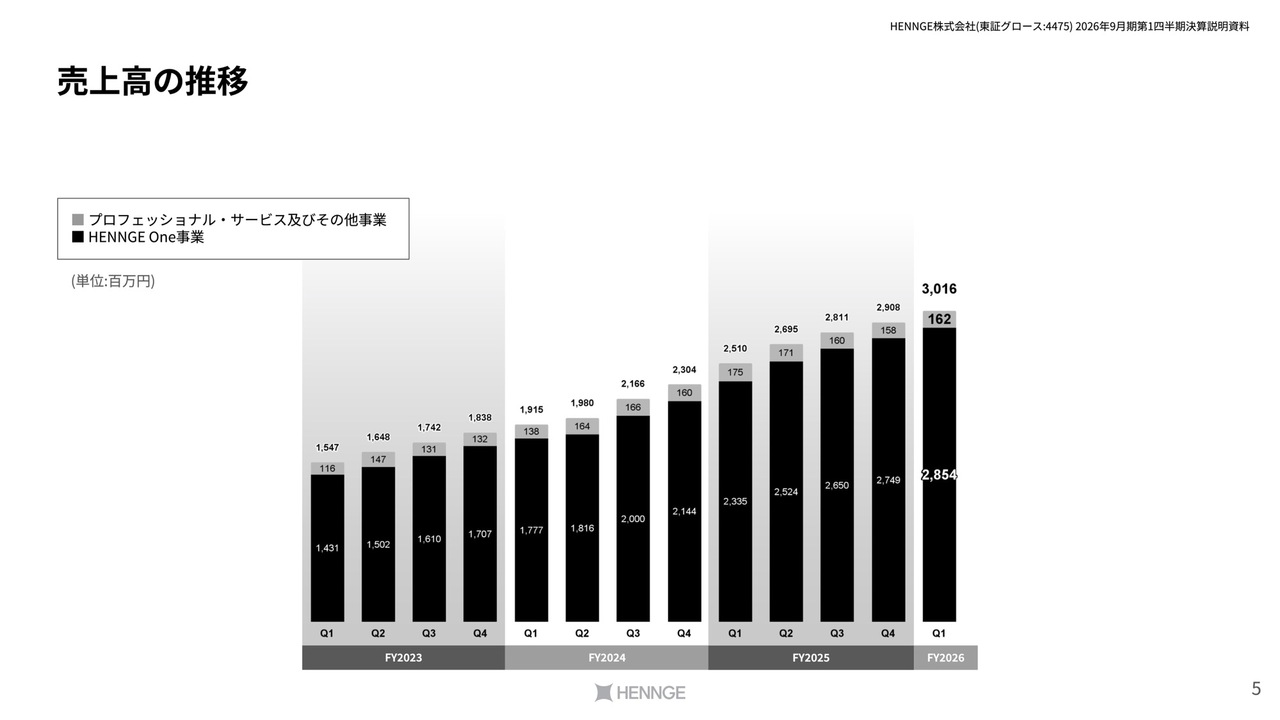 連結売上高の四半期ごとの推移は、スライドのとおりです。HENNGE One事業の売上高はすべてリカーリングの性質を持っており、四半期ごとに増加する傾向となっています。