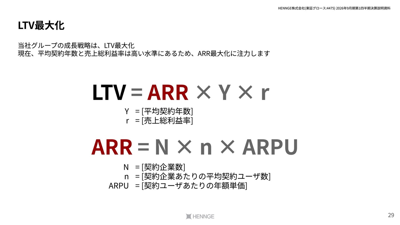 現在、平均契約年数と売上総利益率は、すでに高い水準にあります。したがって、LTVの最大化には、ARRの最大化が必要であるという状況です。私たちは、投資対効果の高い活動を積極的に行い、ARRを積み増すことに注力します。